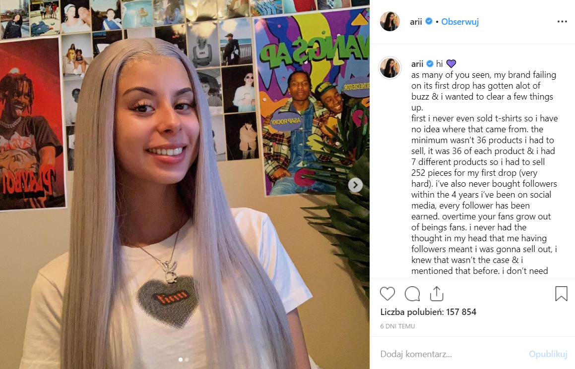 18-letnia influencerka Arii, która cieszy się sporą popularnością w mediach społecznościowych (2,6 mln obserwujących na Instagramie, 837 tys. na YouTubie), wielokrotnie nawiązywała współprace z popularnymi markami, w ramach których reklamowała ich produkty. Niedawno Amerykanka poszła o krok dalej i postanowiła założyć swój własny brand odzieżowy, który w głównej mierze oferował koszulki z nadrukami. Firma mająca za zadanie je wyprodukować, wymagała zamówienia minimum po 36 sztuk każdego z 7 rodzajów ubrań, by móc wysłać je do zainteresowanych. Niestety nie udało się.