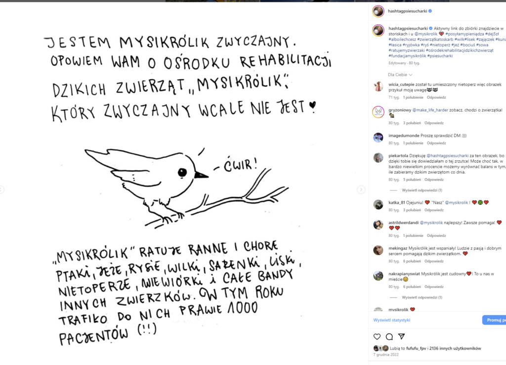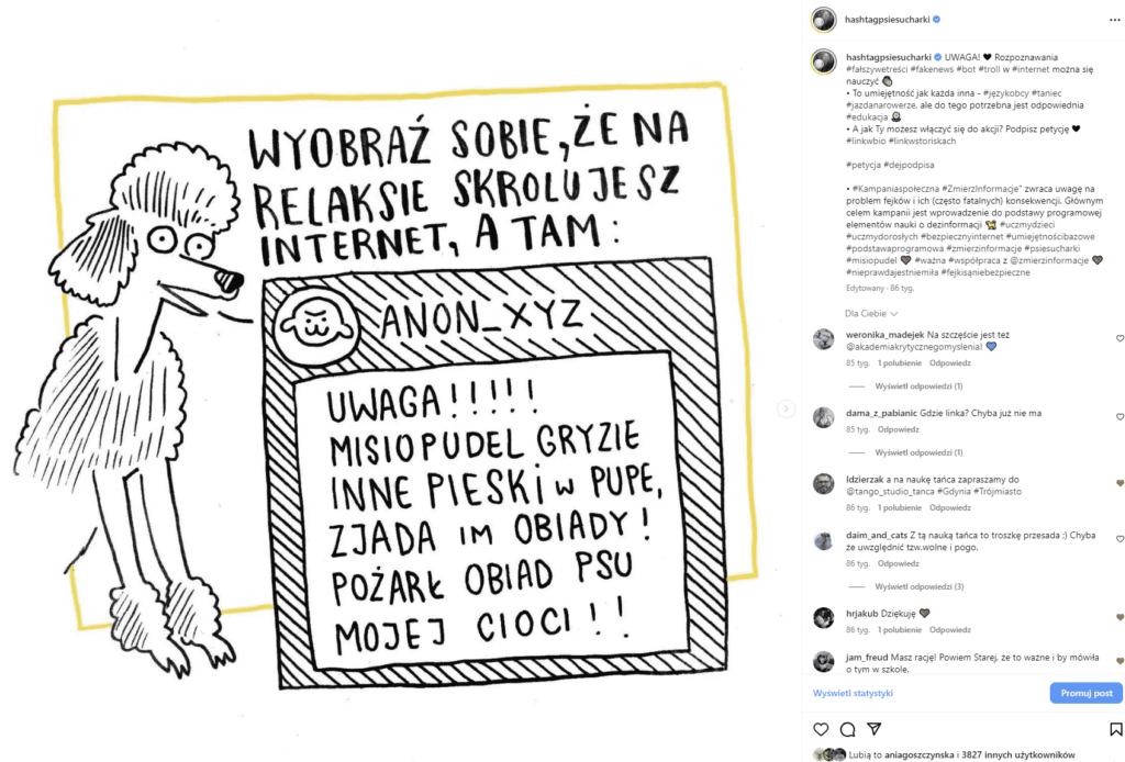 Zdarza mi się wrzucać także posty dotyczące edukacji obywatelskiej – jak i po co brać udział w wyborach, w jaki sposób reagować na przemoc, jak chronić dzikie zwierzęta. Brałam udział w kampaniach dotyczących niemarnowania jedzenia, zapobiegania FAS/FASD, rozpoznawania fake news i innych.
