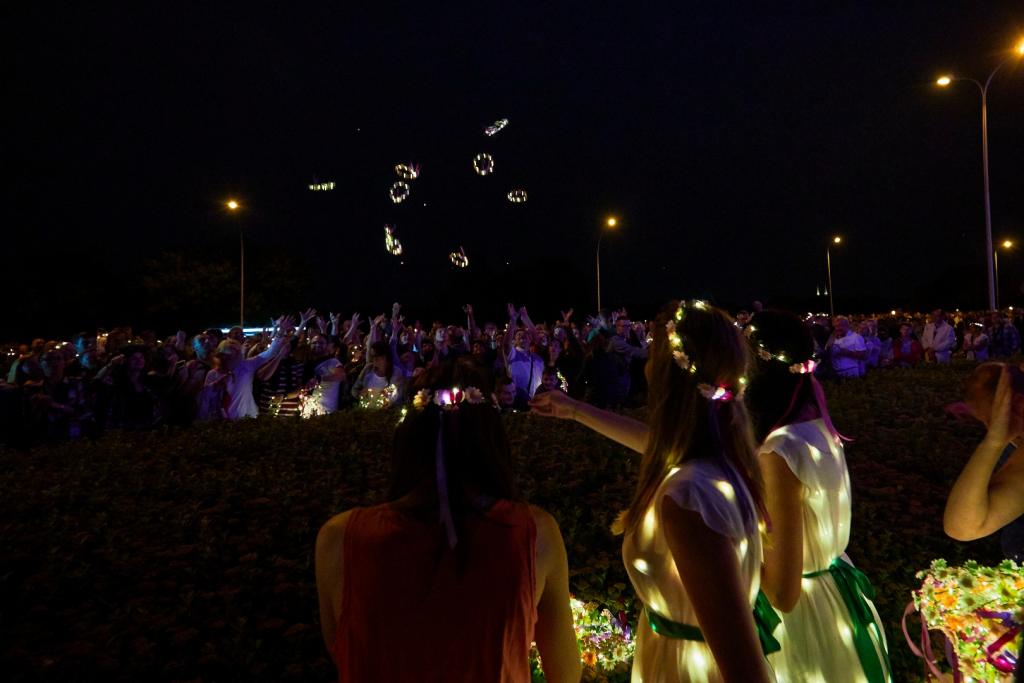 Goście stołecznej Nocy Świętojańskiej byli obdarowywani świetlnymi wiankami przez hostessy ubrane w zaprojektowane specjalnie na tę okazję długie, zwiewne, LEDowe suknie świecące w nocy.