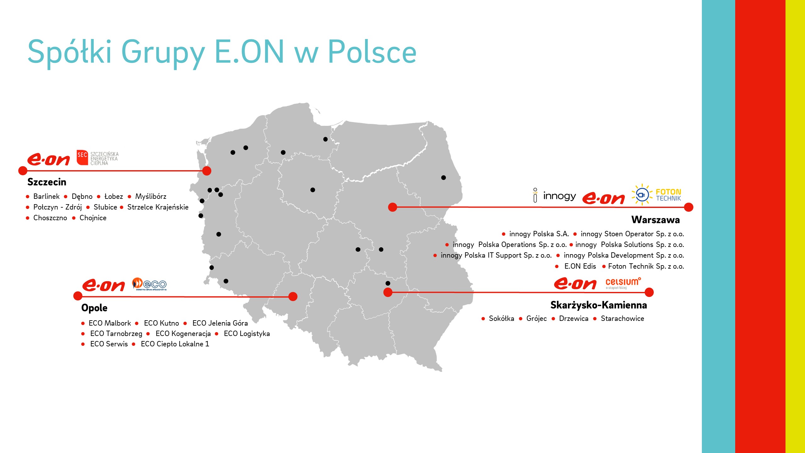 Spółki należące do Grupy E.ON działają w Polsce od 20 lat. Produkują oraz dystrybuują energię elektryczną, gaz, ciepło i chłód do klientów indywidualnych, sektora publicznego i klientów biznesowych na terenie całego kraju. Głównym rynkiem w obszarze sprzedaży energii elektrycznej jest Warszawa. W zakresie produkcji i dostaw ciepła głównymi rynkami działania są Szczecin i Opole. Firma zapowiada dalszy rozwój innowacyjnych, wzajemnie uzupełniających się produktów i usług dla klientów. Planuje także dalsze inwestycje w nowoczesną infrastrukturę energetyczną w Polsce, mając jednocześnie na uwadze uwarunkowania gospodarcze jak i potrzeby społeczności lokalnych.