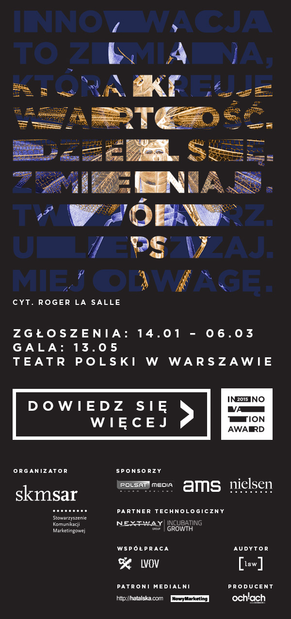 W DNA innowacyjności wpisana jest zmiana, dlatego też projekt – znany wcześniej pod marką Media Trendy, zmienił się w Innovation AD (Innovation Award – konkurs i Innovation Day – konferencja). I jest to prawdziwa innowacyjna transformacja – nie tylko na poziomie nazwy. Poprzez konkurs i konferencję chcemy inspirować, zachęcać do podejmowania ryzyka oraz edukować rynek w zakresie wdrażania innowacji. Budujemy wizerunek tego projektu, jako najważniejszej platformy o innowacyjności w dziedzinie komunikacji marketingowej i marketingu w Polsce.