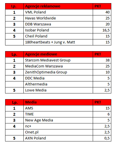 W rankingu agencji, agencji mediowych i mediów, zwyciężyły odpowiednio: VML Poland, Starcom MediaVest Group oraz AMS. Za nominację przyznawano 1 punkt, za wyróżnienie 5 punktów, a za nagrodę 10 punktów. Przy czym firmy współzgłaszające otrzymały 50% punktów. Grand Prix było nagradzane dodatkowo 15 punktami.