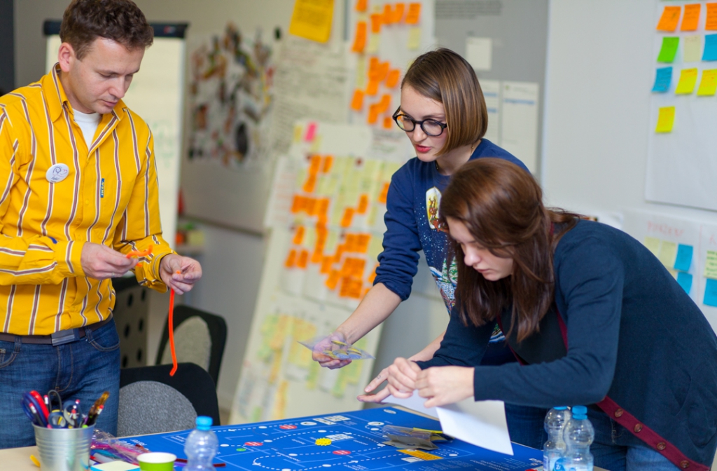 Następnym krokiem była weryfikacja skuteczności i atrakcyjności pomysłów w procesie prototypowania i testowania. Jednocześnie było to przejście ze sfery myślenia do działania, czyli fizyczne przedstawienie najlepszych koncepcji za pomocą scenek oraz dostępnych pod ręką materiałów – sznurków, kartonów, rekwizytów. Dzięki zaprezentowaniu i informacji zwrotnej od wszystkich uczestników kursu najłatwiej było wybrać te, które zasługują na szczegółowe dopracowanie i przetestowanie ich w zaawansowanej wersji.