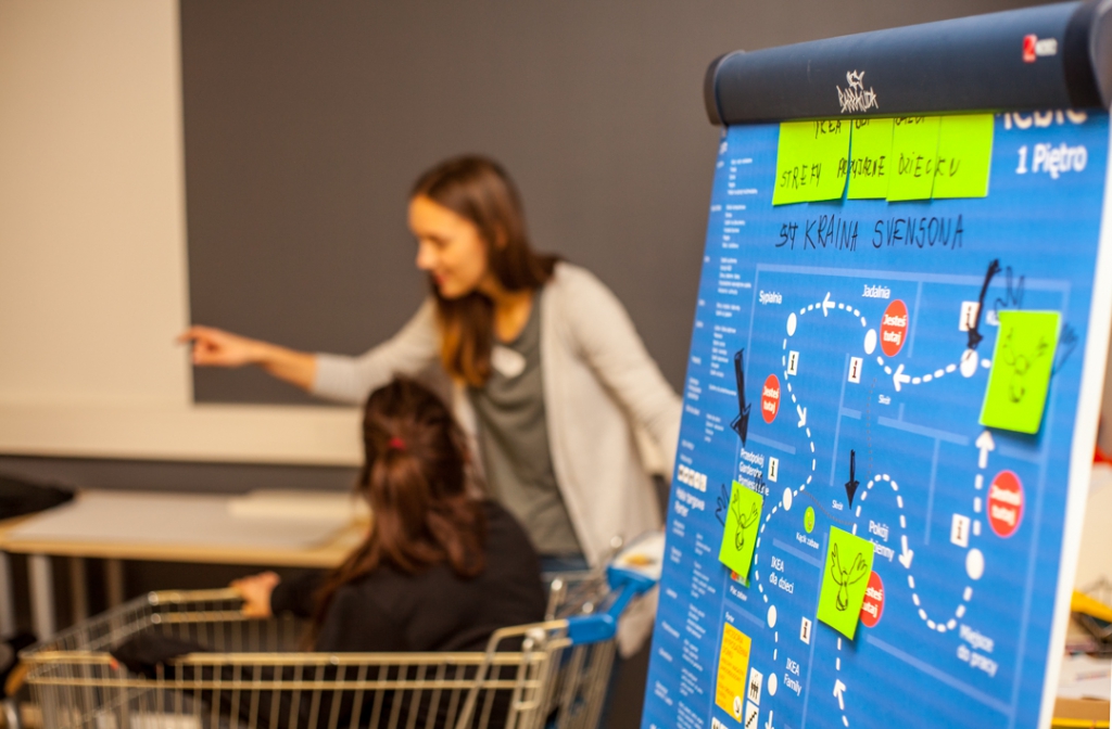 – Bardzo konkretne i analityczne podejście do potrzeb klienta – to jest coś, co przyda mi się w procesie projektowym w każdej dziedzinie – tak o swoich doświadczeniach z „Pracownika 2.0” mówi uczestniczka, Jasmin Hamadi. W ramach kursu studenci poznali inne – poza wywiadami – narzędzie przybliżające doświadczenie grup docelowych, a mianowicie stworzyli mapę drogi klienta. W trakcie jednych zajęć opuścili salę szkoleniową, by w przestrzeni sklepu przeżyć proces zakupowy. Podczas gdy jedna osoba z grupy wczuwała się w rolę wskazanego użytkownika – nastolatka, studenta, matki z dzieckiem czy seniora – pozostali uczestnicy opisywali jej sposób poruszania się po sklepie, drogę do wyboru określonych produktów oraz odczucia, które werbalizowała podczas nabywania potrzebnych towarów. Wszystko po to, by precyzyjnie sformułować insighty, dzięki którym możliwe było stworzenie jak najlepszych rozwiązań.
