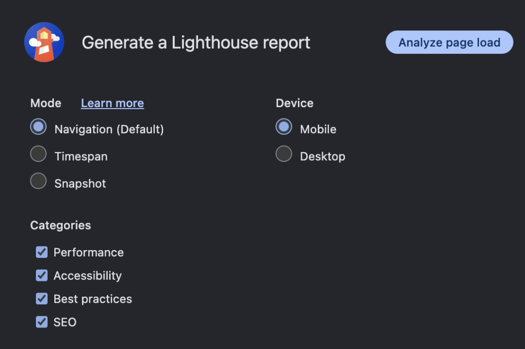 Uruchom test dla „Mobile” i sprawdź szczegółowe metryki i sugestie optymalizacji.