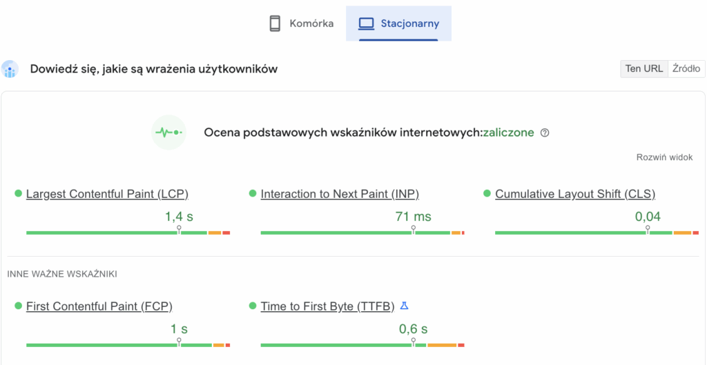 Ważne: Sprawdź zarówno wersję mobilną jak i desktop. Skup się głównie na mobile, bo tam ruch w e-commerce jest największy i najbardziej wrażliwy na opóźnienia.