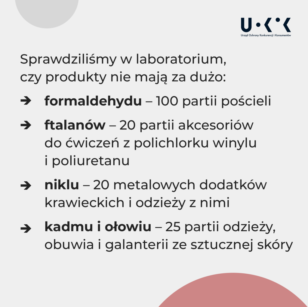 Przedstawiciele UOKiK sprawdzili, czy kontrolowane produkty zawierają formaldehyd, ftalany, nikiel, kadm i ołów w dopuszczalnych ilościach. Nieprawidłowości zanotowano w przypadku 7 proc. produktów: piłek do ćwiczeń, mat, skakanek, hantli i kompletów pościel. Najgorsze sytuacja przedstawia się w przypadku ilości ftalanów w hantlach (320-krotne przekroczenie) i formaldehydu w pościeli (ośmiokrotne).
