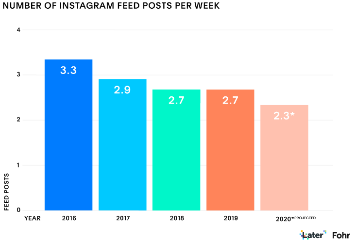 Dochodzimy do miejsca, w którym wideo powoli wypiera zdjęcie. Ale to nie jedyny kierunek zmian jaki obserwujemy. Platforma Fohr*, w pełni dedykowana influencer marketingowi, po przeanalizowaniu swojej bazy twórców zaobserwowała, że zmieniają się ich nawyki publikowania postów. Widać to szczególnie w takim aspekcie, jak częstotliwość, która znacznie spadła. Zakłada się, że w 2020 roku influencerzy będą publikowali swoje treści na siatce tylko dwa razy w tygodniu, co jest największym spadkiem obserwowanym od 2016 roku.