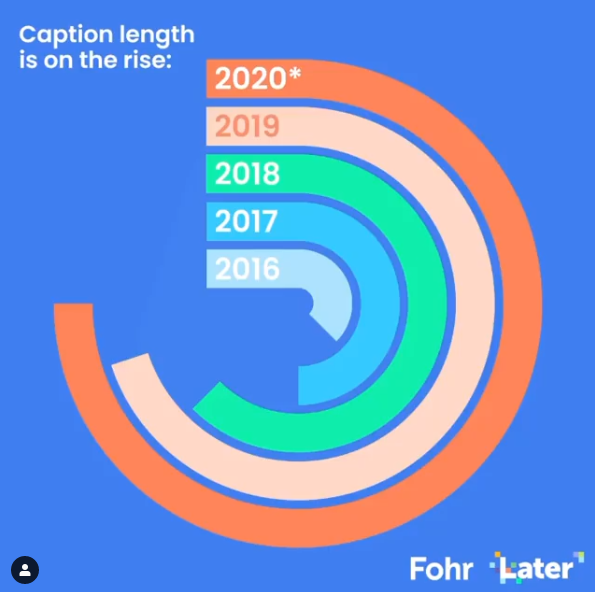 Jednak nie to powoduje największe zdziwienie. Later*, platforma do planowania postów na Instagramie, a także do multifunkcjonalnego zarządzania kontem, przedstawiła dane związane z długością publikowanych na portalu opisów do zdjęć. Pamiętam początki Instagrama, kiedy w copy pod fotografią dodawało się tylko kilka, kilkanaście hashtagów i zdanie bądź dwa. Dzisiaj posty coraz częściej są okraszone obszernym komentarzem, co, mimo powszechnie panującej opinii o pomijaniu i nie czytaniu długich opisów, spotyka się z aprobatą użytkowników.