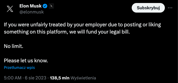 Tego rodzaju rozwiązanie oferuje także platforma X, a subskrybenci X Premium (dawniej znanej jako Twitter Blue) mogą teraz ukrywać swoje polubienia i znaczniki wyboru. Co więcej, Elon Musk, właściciel platformy X, poszedł o krok dalej, oferując wsparcie prawników dla tych, którzy zostali niesprawiedliwie potraktowani przez pracodawców z powodu swojej aktywności na X.