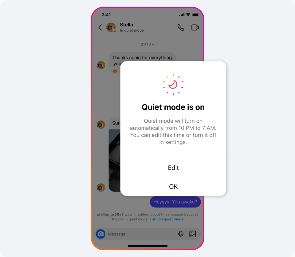 Instagram wprowadza również funkcję Quiet Mode (niedostępna jeszcze w Polsce) – nowy sposób, aby użytkownicy mogli zaznaczyć, kiedy są niedostępni. Jeśli użytkownik włączy Quiet Mode, zobaczy na swoim profilu status „w trybie cichym”, a funkcja wyciszy powiadomienia i wyśle automatyczną odpowiedź na wiadomości prywatne od przyjaciół i obserwujących.