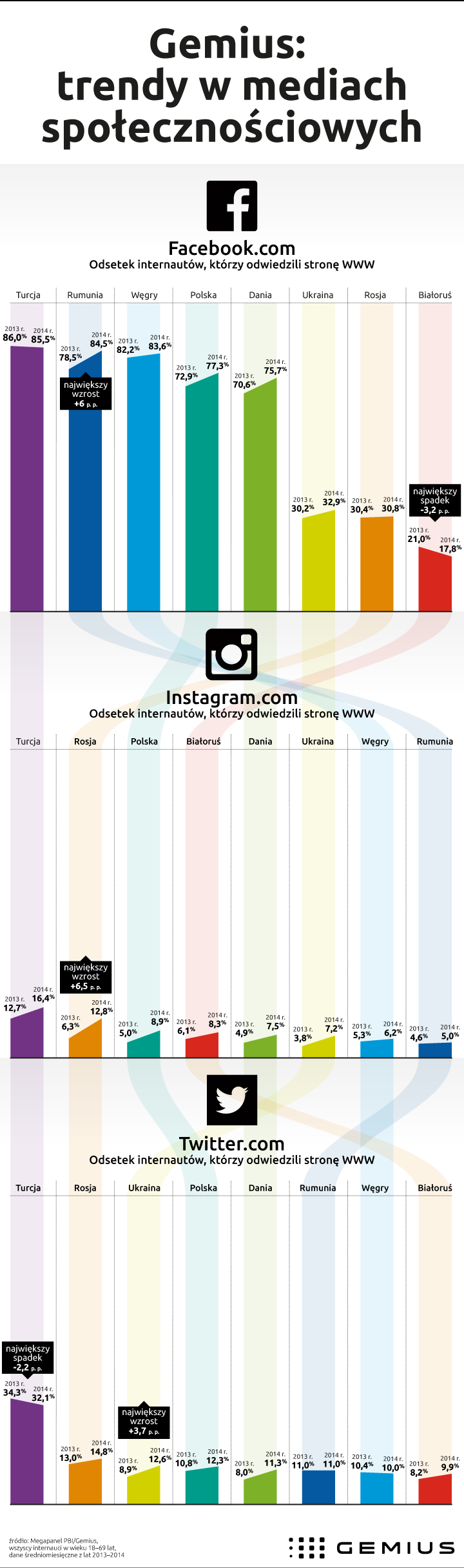 Facebook, Instagram i Twitter to dla marketerów wartościowe kanały komunikacji z potencjalnymi konsumentami. Gemius postanowił sprawdzić, jakim zainteresowaniem te serwisy społecznościowe cieszą się wśród internautów między 18 a 69 rokiem życia. Pod uwagę wzięto wybrane kraje: Turcję, Rosję, Ukrainę, Polskę, Danię, Rumunię, Węgry, Białoruś. Analiza dotyczyła danych średniomiesięcznych z lat 2013–2014.