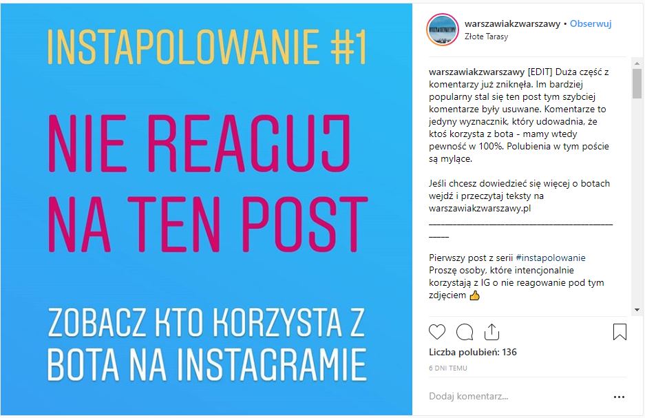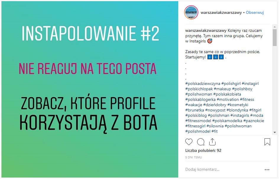 Bloger Warszawiak z Warszawy postanowił zobrazować ten problem i sprawdzić, jakie konta wykorzystują boty na Instagramie, by zwiększyć swoją popularność. Kilka dni temu rozpoczął akcję „Instapolowanie” i dodał dwa posty z kilkunastoma popularnymi hashtagami. Poprosił tym samym swoich obserwatorów o nie komentowanie tych wpisów i nie lajkowanie go, by akcja mogła się udać.