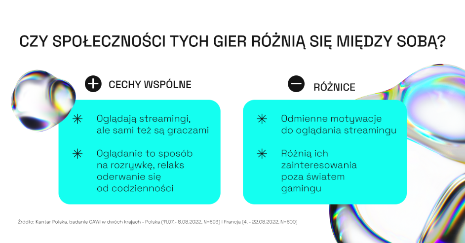 Każdy z badanych tytułów realizuje inny segment potrzeb widzów streamów gier komputerowych. Pierwszy z nich to relaks, odprężenie i wyluzowanie. Drugi to doenergetyzowanie, ekscytacja i zastrzyk adrenaliny. Co ciekawe, ten pierwszy nieznacznie dominuje nad drugim.