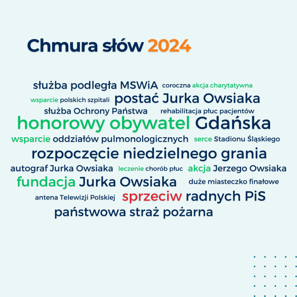 Zmiany, jakie komunikatach w kontekście Jurka Owsiaka i Wielkiej Orkiestry Świątecznej Pomocy zaszły na przestrzeni ostatniego roku (2024-2025) obrazują chmury słów będące elementem rozszerzenia raportu.