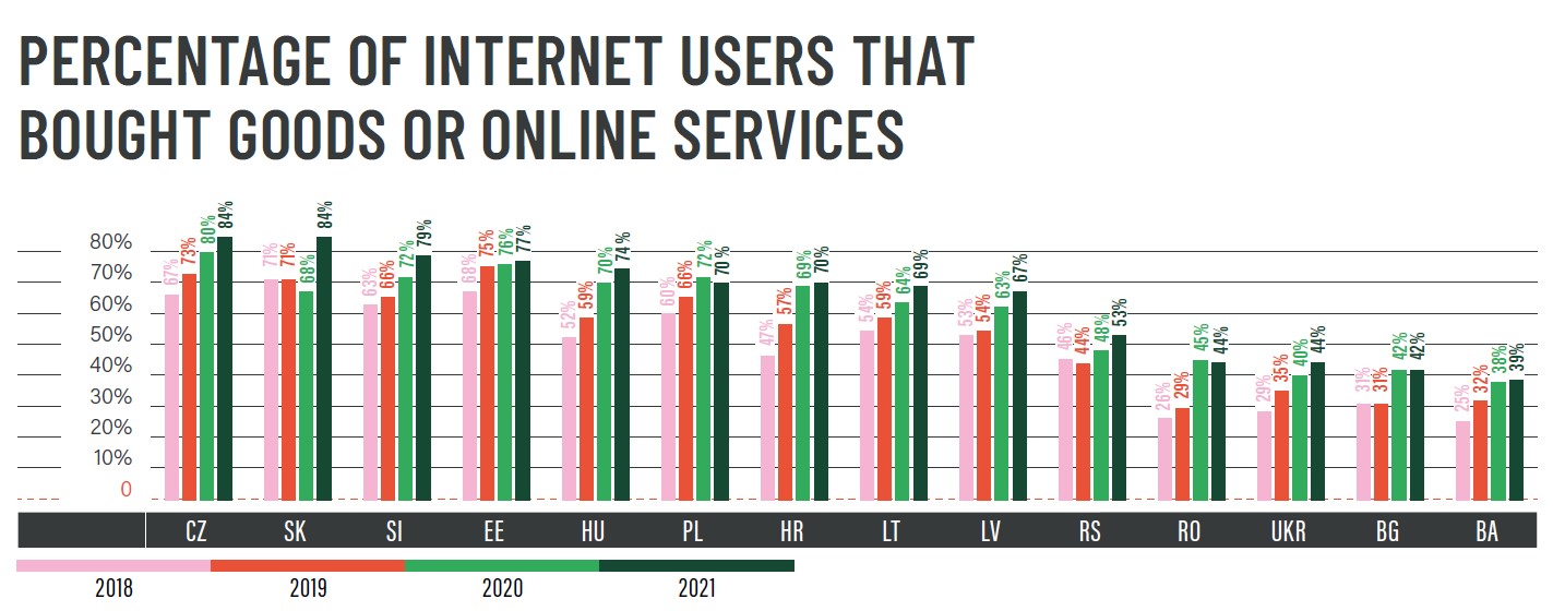 Zyskującym segmentem jest nadal e-commerce. Według ecommerce-europe.eu (2021) odsetek internautów, którzy kupowali towary online, wzrósł o 5%, a tempo wzrostu obrotów e-commerce B2C w Centralnej i Europa Wschodnia była wyższa niż w Europie Zachodniej (odpowiednio 18%, 16% i 12%).