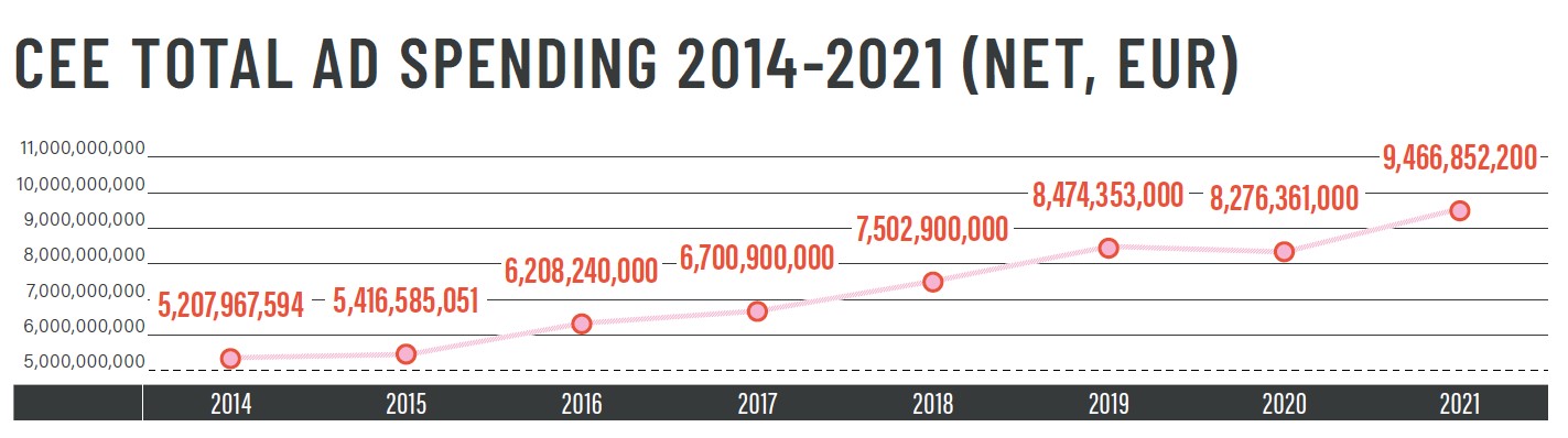 Wśród wspomnianych sprzyjających warunków w 2021 roku, branża reklamowa z nawiązką odbudowała 2% straty poniesione w czasie pandemii w 2020. Rynek CEE osiągnął wolumen netto 9,5 mld euro, przy 14% wzroście w 2021 roku. Głównym beneficjentem stał się segment reklamy digital, który odnotował 18% wzrost, przejmując tym samym w ujęciu rocznym, ponad połowę ogólnych inwestycji na reklamę.