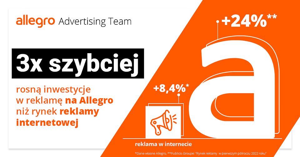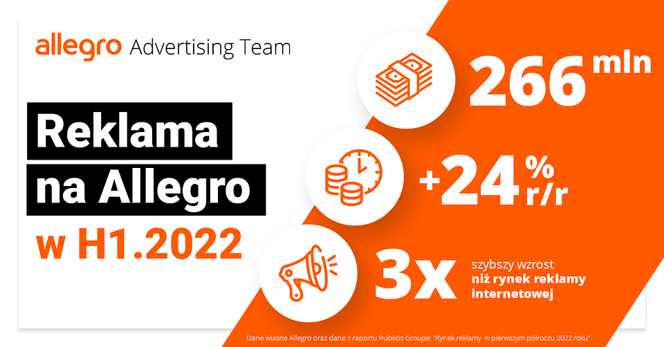 W pierwszym półroczu br. przychody Grupy Allegro z reklamy osiągnęły ponad 266 mln zł. To wynik o 24% wyższy w stosunku do analogicznego okresu ubiegłego roku. Według obliczeń Publicis Groupe, wartość budżetów na reklamę w internecie w tym okresie wzrosła o 8,4%.* Inwestycje w reklamę na Allegro rosną więc blisko 3 razy szybciej niż rynek reklamy internetowej w Polsce.