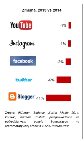 Słabnie również tendencja do korzystania z wielu platform społecznościowych (hyper social) – w 2014 roku tylko 8 proc. internautów korzystało z 5 serwisów społecznych miesięcznie, podczas gdy w 2013 roku robiło to 18 proc..
