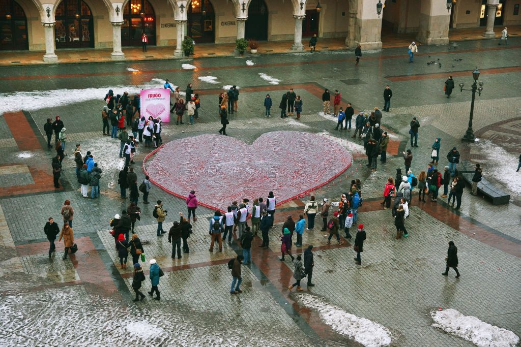 Różowa mikstura zalała krakowski Rynek! W sercu miasta powstało tętniące różem, gigantyczne Walentynkowe serducho. 50 tys. butelek skrywających owocowy napój trafiło do rąk zakochanych, poszukujących drugiej połówki i wszystkich fanów dobrej zabawy, którzy wspólnie z FRUGO świętowali Walentynki.