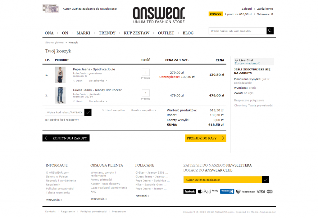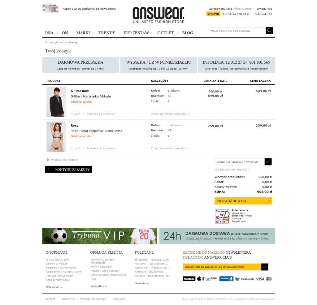 Najistotniejsze zmiany zostały wprowadzone w obszarze koszyka (m. in. dzięki dokładnej analizie ścieżek w Google Analytics zespół projektowy wiedział, że to tutaj należy szukać największych możliwości podniesienia współczynnika konwersji).
