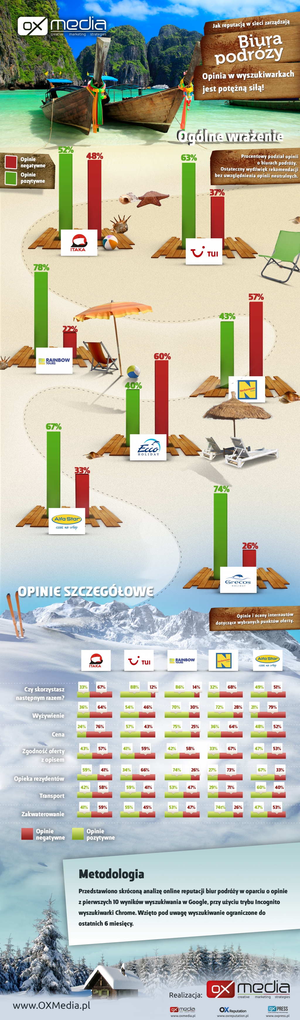 Analizując ogólne wrażenie i zgeneralizowane opinie internautów najlepiej wychodzi Rainbow Tours oraz Grecos Holiday. Nadal jednak dla pięciu spośród siedmiu największych biur podróży w Polsce odsetek negatywnych wypowiedzi przekracza 33%. Zagłębiając się w opinie szczegółowe można zauważyć, że nie ma pośrednika, u którego przeważałyby pozytywne wypowiedzi odnoszące się do zgodności oferty z opisem. Internauci mają najmniej pochlebne zdanie dotyczące konkretnych punktów oferty ITAKA i Alfa Star, a zarzuty związane są przede wszystkim z wyżywieniem oraz ceną. Mimo krytycznego stosunku do opieki rezydentów biura TUI, większość rekomendujących w sieci osób zdecydowałaby się skorzystać z usług pośrednika następnym razem. Wybierając Neckermanna, internauci doceniają zakwaterowanie oraz jedzenie, niestety swoje niezadowolenie mocno podkreślają dla każdej innej propozycji z oferty.