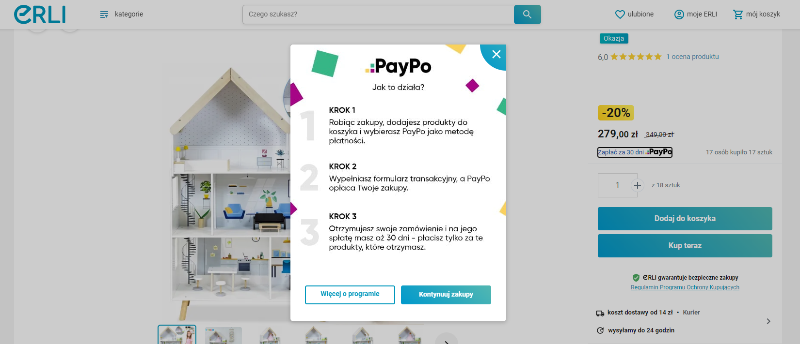 Czasami bywa też tak, że klient potrzebuje czasu do namysłu lub ma jakieś wątpliwości. Wtedy ogląda towar wiele razy lub nie finalizuje transakcji w koszyku od razu po dodaniu do niego produktu. W takich momentach również warto wysłać mu informację o możliwości skorzystania z płatności odroczonych. Zyskując możliwość zobaczenia, sprawdzenia, czy przymierzenia produktu jeszcze przed zapłatą, klient czuje się bezpieczniej i szybciej podejmuje decyzję o finalizacji transakcji. Wbrew pozorom to bardzo istotna kwestia, gdyż wciąż dla 64% kupujących ważnajest możliwość obejrzenia wybranych towarów „na żywo” przed podjęciem finalnej decyzji o zakupie online.