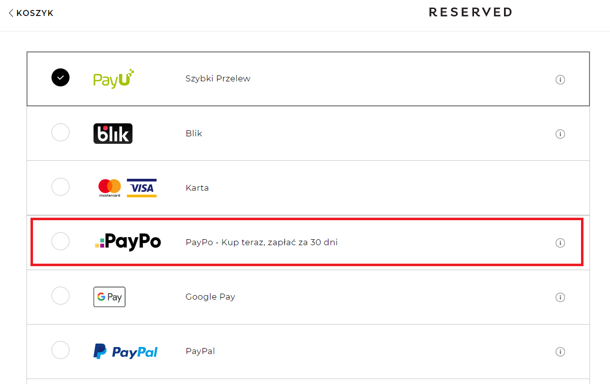 Po wdrożeniu, PayPo pojawi się jako opcja płatności dostępna w Twoim sklepie internetowym. Klient będzie mógł ją wybrać w koszyku zakupowym, finalizując swoje zamówienie. W tym miejscu nie mamy dużo przestrzeni, aby podać więcej szczegółów na temat tego, jak działa ta forma płatności. Nie jest to też do końca wskazane, gdyż wszystkie kroki na ścieżce zakupowej klienta powinny być przejrzyste i rzeczowe. Warto jednak odpowiednio zapozycjonować usługę i aktywnie wykorzystywać tutaj nie tylko nazwę “PayPo” czy logotyp, ale również sformułowanie – “Kup teraz, zapłać za 30 dni”. Dzięki temu klient od razu wie, na czym polega ta opcja płatności i jest świadomy głównego benefitu, czyli odroczenia płatności na 30 dni.