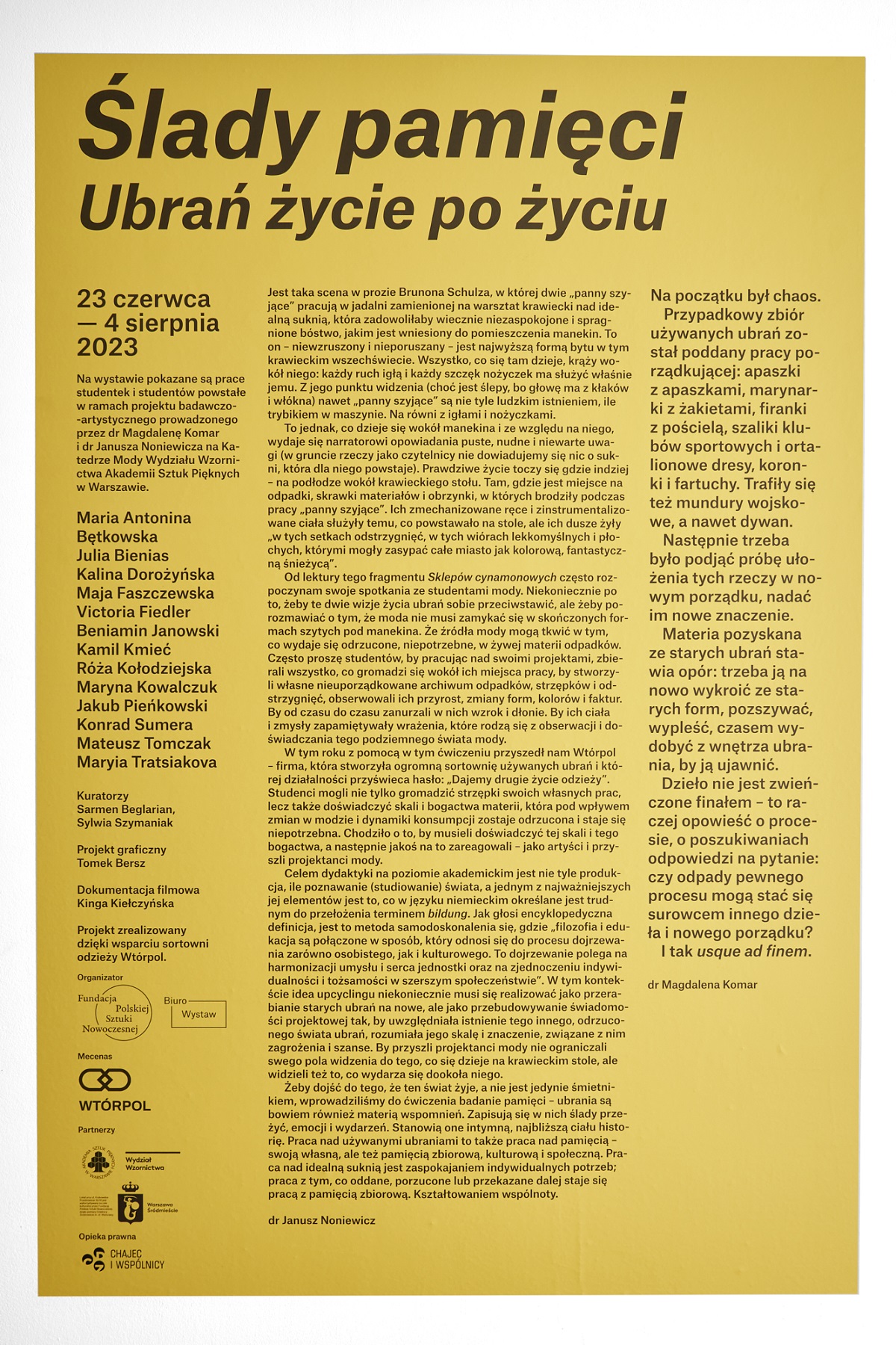Jako zwieńczenie kilkumiesięcznego projektu studenci, wykorzystując metody upcyclingu i recyklingu stworzyli sylwetki modowe lub obiekty codziennego użytku. Materiałem pracy studentów stały się znalezione w sortowni ubrania posiadające swoje własne opowieści. Rezultaty ich pracy można było obejrzeć przez dwa miesiące w formie wystawy performatywnej w przestrzeni Biura Wystaw galerii Fundacji Sztuki Nowoczesnej przy Krakowskim Przedmieściu w Warszawie.