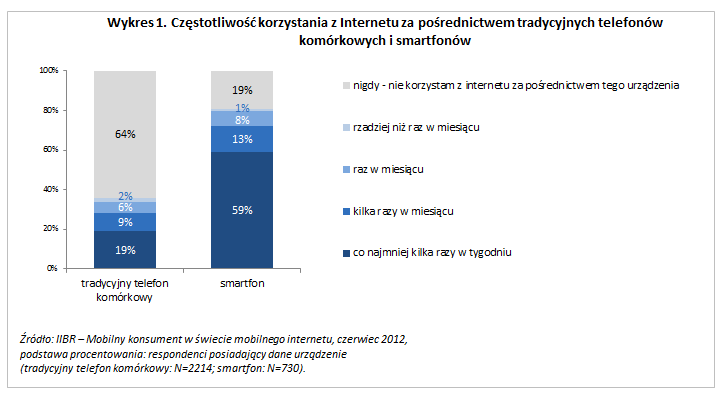 „Tradycyjne” telefony zaczynają być wypierane przez smartfony umożliwiające w dowolnym miejscu i czasie bycie w stałej, internetowej łączności ze światem. Ponad połowa ich posiadaczy (59%) wykorzystuje je do łączenia się z siecią co najmniej kilka razy w tygodniu. W zestawieniu z wynikami uzyskanymi wśród użytkowników „tradycyjnych telefonów komórkowych” widać w tym zakresie wyraźną różnicę – posiadacze „tradycyjnych słuchawek” znacznie rzadziej wykorzystują je do surfowania po internecie.