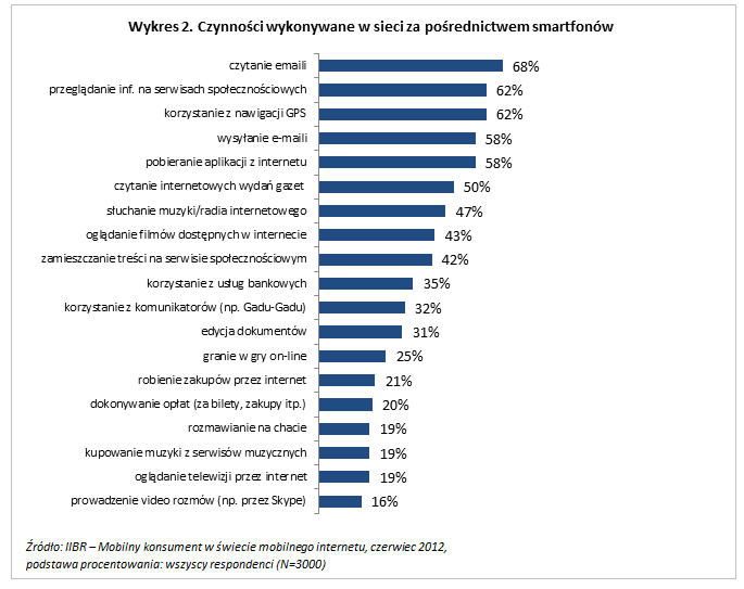 Z raportu „Mobilny konsument w świecie mobilnego internetu”, przygotowanego przez Interaktywny Instytut Badań Rynkowych (IIBR), wynika, że już co piąty internauta posiada smartfon, za pomocą którego łączy się z siecią, komunikuje ze znajomymi czy korzysta z nawigacji GPS.