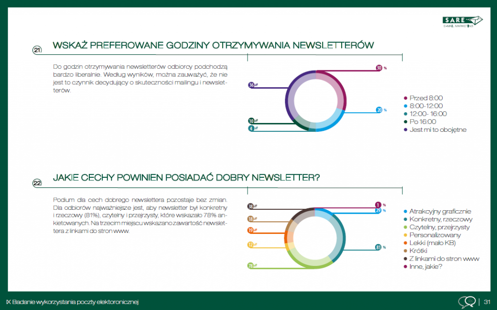 94 proc. uczestników badania przeprowadzonego przez SARE potwierdza, że ich firma będzie wykorzystywała e-mail marketing w przyszłych działaniach. Aż 74% marketerów i właścicieli firm zauważa wymierne korzyści wynikające z jego stosowania w realizacji przedsięwzięć marketingowych. Wnioski te wynikają z dziewiątego badania wykorzystania poczty elektronicznej w Polsce.