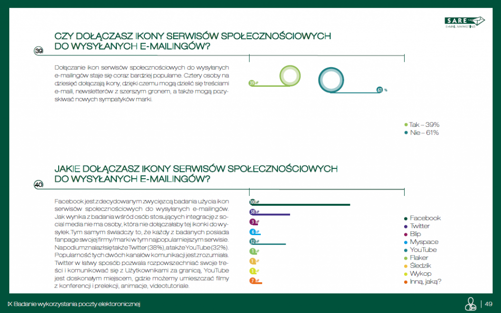Marketerzy mają świadomość, iż integracja e-mail marketingu z mobile marketingiem, social media może podwyższać skuteczność działań. E- mail marketing najczęściej integrowany jest z narzędziami online: tj. social media – 55%, reklama w wyszukiwarkach – 47%, display – 36%, kampanie SMS – 25%. Wśród osób stosujących integrację z social media nie ma osoby, która nie dołączałaby ikonki Facebooka do wysyłek. Na podium znalazł się także Twitter (38%), a także YouTube (32%).
