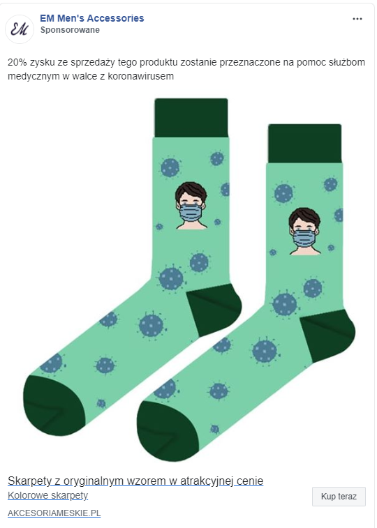 Niektóre firmy postanowiły przeznaczyć część dochodów ze sprzedaży na cele warki z koronawirusem. Np. sklep EM Me’s Accessories sprzedaje wyjątkowe skarpetki, ze sprzedaży których przekaże 20% zysku na pomoc służbom medycznym.