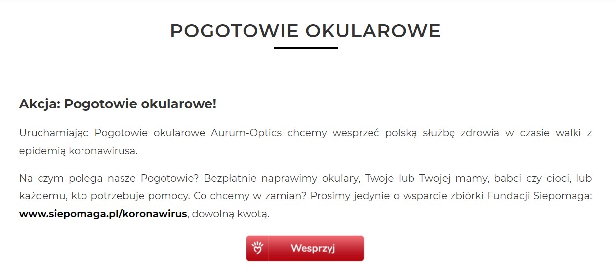 Sieć salonów optycznych Aurum Optics postanowiła podłączyć się pod zrzutkę w walce z koronawirusem i w zamian za wpłatę darowizny specjaliści marki będą naprawiać okulary każdej osobie, która ma ochotę do akcji dołączyć.