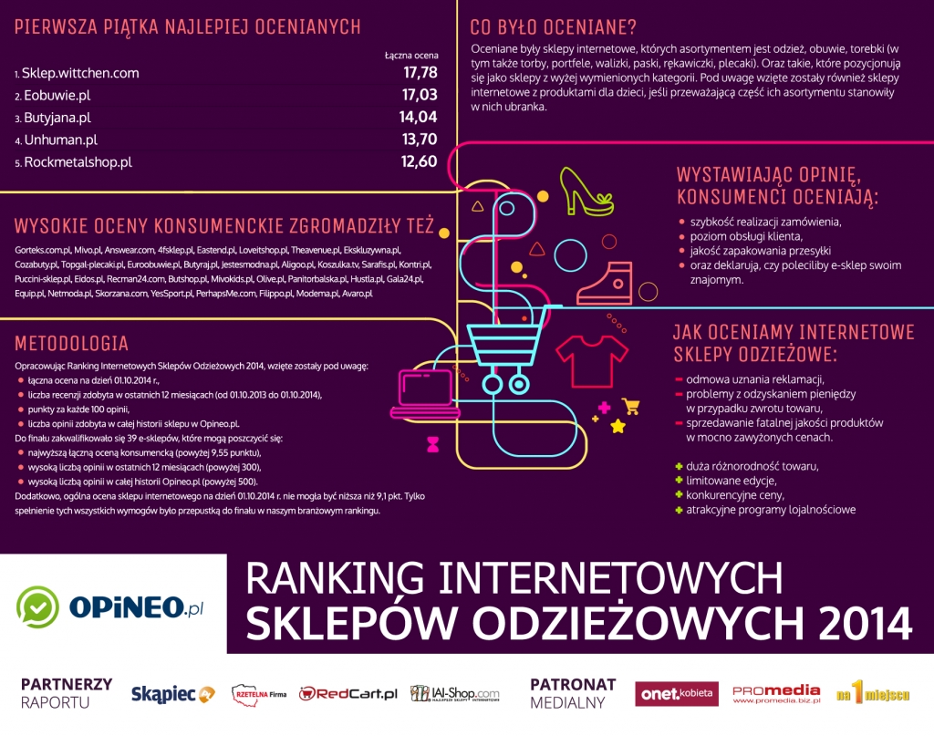 — Cechy, za które konsumenci chwalą e-sklepy z branży modowej, to przede wszystkim: duża różnorodność towaru, limitowane edycje, konkurencyjne ceny i atrakcyjne programy lojalnościowe — analizuje wyniki rankingu Paweł Kucharzak, prezes zarządu Opineo.pl. — Do grzechów głównych internetowych sklepów odzieżowych z kolei zaliczają się: odmowa uznania reklamacji, problemy z odzyskaniem pieniędzy w przypadku zwrotu towaru i sprzedawanie fatalnej jakości produktów w mocno zawyżonych cenach.