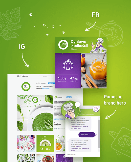 A jeżeli już jesteśmy przy gotowaniu, to nie mogło zabraknąć Pana Kucharza – wprowadziliśmy brand hero, który stał się twarzą metamorfozy marki. Mimo wielu obiekcji (o których więcej tu) zdecydowaliśmy się na bohatera, który zupełnie odmienił zarówno www, jak i cały system komunikacji. Kucharz nie poucza, nie wywyższa się – chce gościć i doradzać innym. Stwierdziliśmy, że to świetne uosobienie archetypu „zwykłego gościa” wraz z elementami przyjacielskiego „opiekuna” oraz miła odmiana od dominującego w tej branży wizerunku lekarza. Kucharz w serwisie PKU Connect to przede wszystkim personalny nawigator i opiekun klienta. Jego zadaniem jest oprowadzanie po serwisie i dostarczanie praktycznych tipów pomocnych w korzystaniu ze strony.