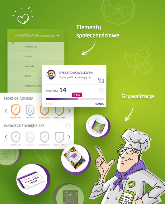 Przygotowany przez nas serwis jest oparty na jak największej ilości elementów społecznościowych. Użytkownicy mogą korzystać z komunikatora na stronie, integracji poprzez dodawanie do znajomych, wewnętrznego forum czy możliwości wprowadzania własnego contentu – przepisów lub artykułów. Jednak jak zachęcić użytkowników do budowania społeczności bezpośrednio na stronie? Niezwykle pomocne okazały się rozmaite elementy grywalizacji!