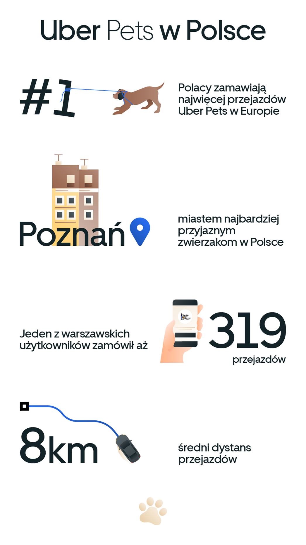 Z danych wynika też, że najbardziej przyjaznym zwierzętom miastem jest Poznań. To tutaj kierowcy najczęściej zgadzają się, aby realizować przejazdy w towarzystwie czworonogów. Miastem, gdzie zamawiamy Uber Pets najczęściej, pozostaje jednak Warszawa – rekordzista skorzystał z tej usługi aż 319 razy!