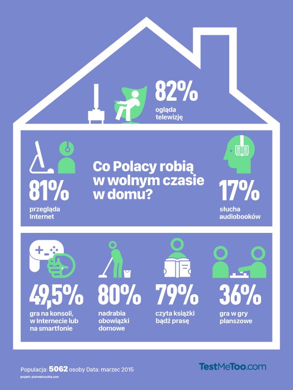Najwięcej osób deklaruje, że ogląda telewizję. Trochę mniej jest słuchających radia, oglądających filmy czy po prostu siedzących w internecie. Na kolejnych miejscach znaleźli się ankietowani, którzy przyznali, że w wolnych chwilach nadrabiają obowiązki domowe, czytają książki bądź prasę lub słucha audiobooków. Prawie połowa deklaruje, ze gra w gry na konsoli, w internecie czy na swoim smartfonie i co zaskakuje trochę ponad 1/3 ankietowanych grywa w tak zwane planszówki, które ostatnimi czasy stają się coraz popularniejsze.