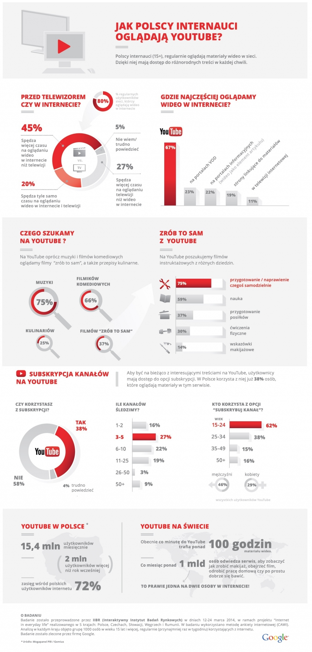 Miejscem, z którego korzystają w tym celu najczęściej jest YouTube, wyprzedzający niemal trzykrotnie plasujące się na drugim miejscu portale VOD i mający wśród swoich użytkowników 38% osób subskrybujących różne kanały. Osoby korzystające z serwisu deklarują, że przede wszystkim oglądają tam muzyczne materiały wideo, komediowe, filmy instruktażowe „zrób to sam” oraz przepisy kulinarne.