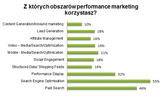 Badanie potwierdziło, że SEO jest najpopularniejszym obszarem performance marketing w Polsce. Firmy korzystają jednak również z wielu innych narzędzi. Już ponad 20% z nich reklamuje się w mobile, a niewiele mniej zdecydowało się na reklamę efektywnościową w social media. Dla większości firm (57 proc.) marketing efektywnościowy to przede wszystkim sposób na bezpośrednie pozyskiwanie klientów.
