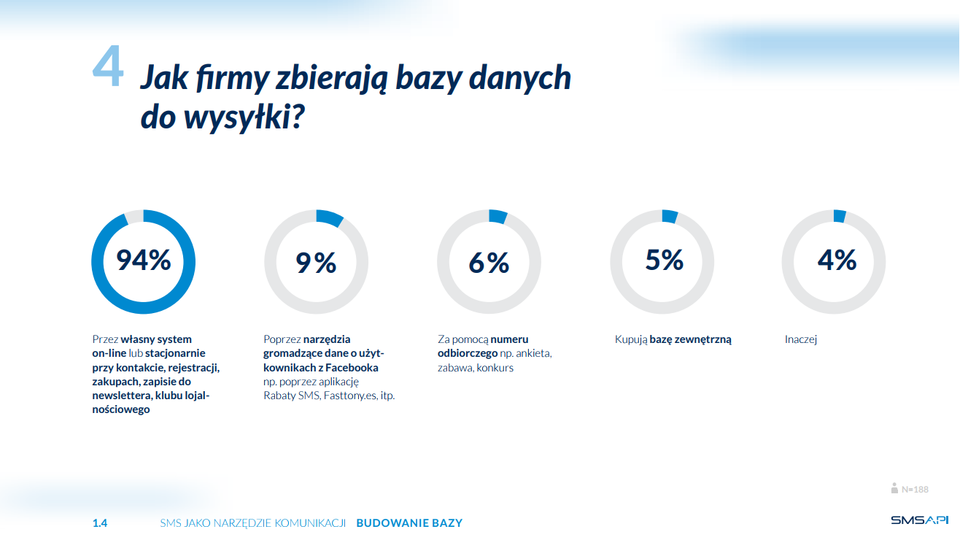 Prawie wszyscy (94 proc.) wysyłają SMS-y do bazy odbiorców zebranej w kanałach własnych, np. przy rejestracji w sklepie, zapisie do newslettera itp. Jedynie 5 proc. firm kupuje bazę zewnętrzną. Co to oznacza? Że klienci doceniają i rozumieją permission marketing – stawiają na działania za przyzwoleniem, bo wiedzą, że takie przynoszą o wiele lepszy efekty.