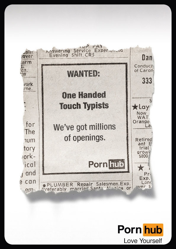 W ubiegłym roku Pornhub poszukując nowego dyrektora kreatywnego, zorganizował konkurs na najlepszą, inteligentną reklamę dotyczącą serwisu, która mogłaby być pokazana bez cenzury i ograniczeń wiekowych. Forma kreacji była dowolna, ponieważ mogły to być zarówno spoty telewizyjne i online, jak i reklamy outdoor czy w prasie. W finale znalazło się kilkanaście prac, z których wybrano jedną. Zwycięzca podpisał z firmą roczną umowę na objęcie stanowiska dyrektora kreatywnego, a jego kreacja niedługo później zawisła na Times Square w Nowym Jorku.