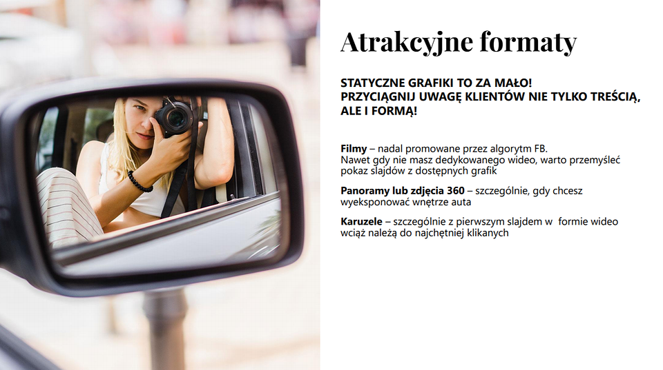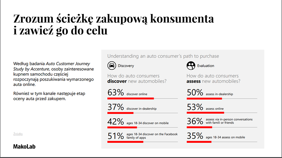 Potencjał na promowanie salonów samochodowych w Internecie jest całkiem spory. Przede wszystkim dealerzy powinni zadbać o swoją widoczność w sieci i związane z tym działania SEO. Nie należy zapominać także o reklamie w Google i budowania wizerunku w social mediach. 78% badanych korzysta z social mediów decydując się na zakup samochodu. 57% twierdzi, że reklamy w social mediach pomogły im w znalezieniu aut. W szczególności warto rozwijać kanał YouTube. Filmy z jazdy próbnej mogą zastąpić potrzebę osobistego zobaczenia samochodu. 64% osób zainteresowanych zakupem samochodu twierdzi, że nowe formaty wideo, takie jak np. filmy 360°, przekonają ich do zakupu samochodu bez konieczności odbycia jazdy próbnej. Warto także wykorzystywać potencjał Messengera. Reklama konwersacyjna to szansa na dotarcie do klienta w bardziej osobisty, bezpośredni sposób.