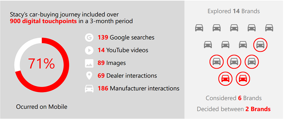 Zanim Stacy kupiła auto, miała kontakt z marką ponad 900 razy! (Rys. 1). Te interakcje miały formę wyszukiwań, wizyt, wyświetleń wideo i kliknięć w Google, YouTube, witrynach producentów, witrynach dealerów i witrynach z recenzjami. To oznacza, że warto rozwijać kanał sprzedaży online i stawiać na działania reklamowe, które skutecznie trafiają z przekazem do konkretnego użytkownika.