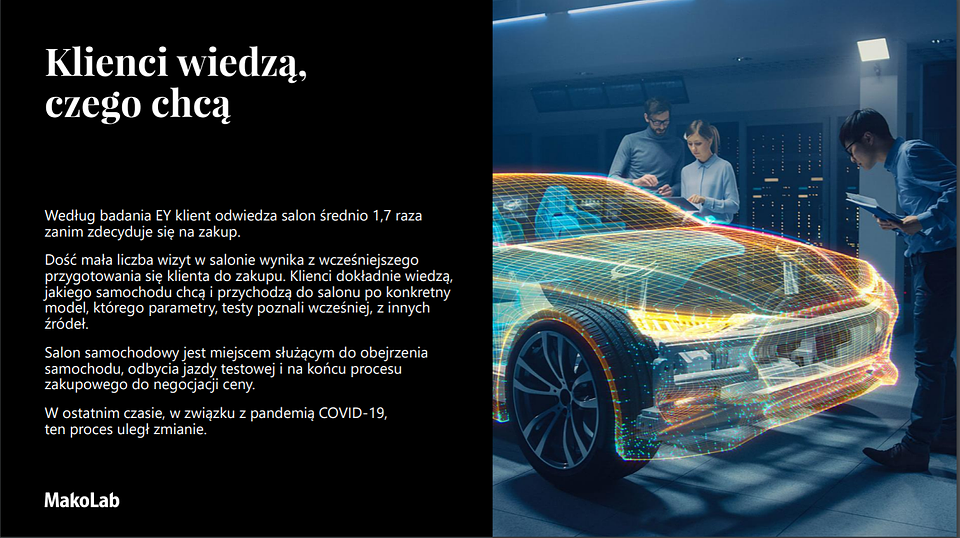 Według badania EY Automotive Survey 2019, 80% użytkowników wolałoby kupić nowy samochód bezpośrednio w salonie. Na pytanie o to, czego by im brakowało podczas zakupu nowego samochodu przez Internet, 45% wskazało możliwość zobaczenia auta w rzeczywistości. Technologia nie zna jednak ograniczeń i stawia czoła wyzwaniom. Dziś bez wychodzenia z domu można dokładnie obejrzeć samochód w wirtualnym salonie. Możemy rozsiąść się wygodnie w fotelu, zaparzyć ulubioną herbatę, wziąć laptopa na kolana i rozpocząć wycieczkę po wirtualnym salonie, na przykład dzięki systemowi Virtual Car 360.