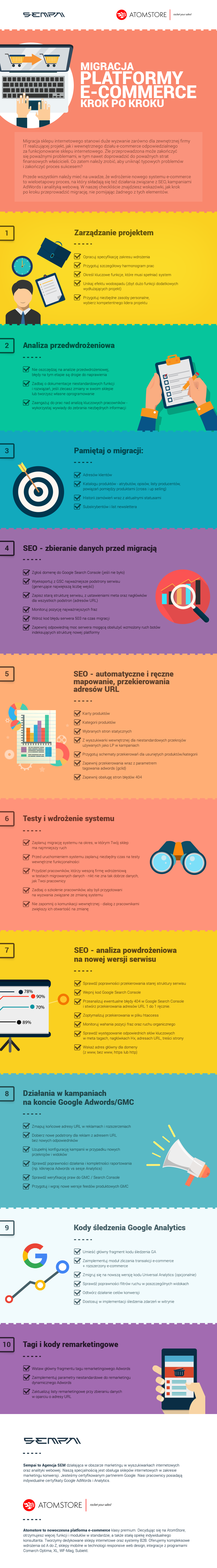 Lista kontrolna została podzielona na 10 głównych sekcji, a te z kolei dokładnie opisane. Dlatego przeprowadzając migrację, warto zachować proponowaną kolejność. Wszystkie rekomendacje bazują na doświadczeniach Agencji Interaktywnej z ponad 10-letnim doświadczeniem w branży ecommerce.