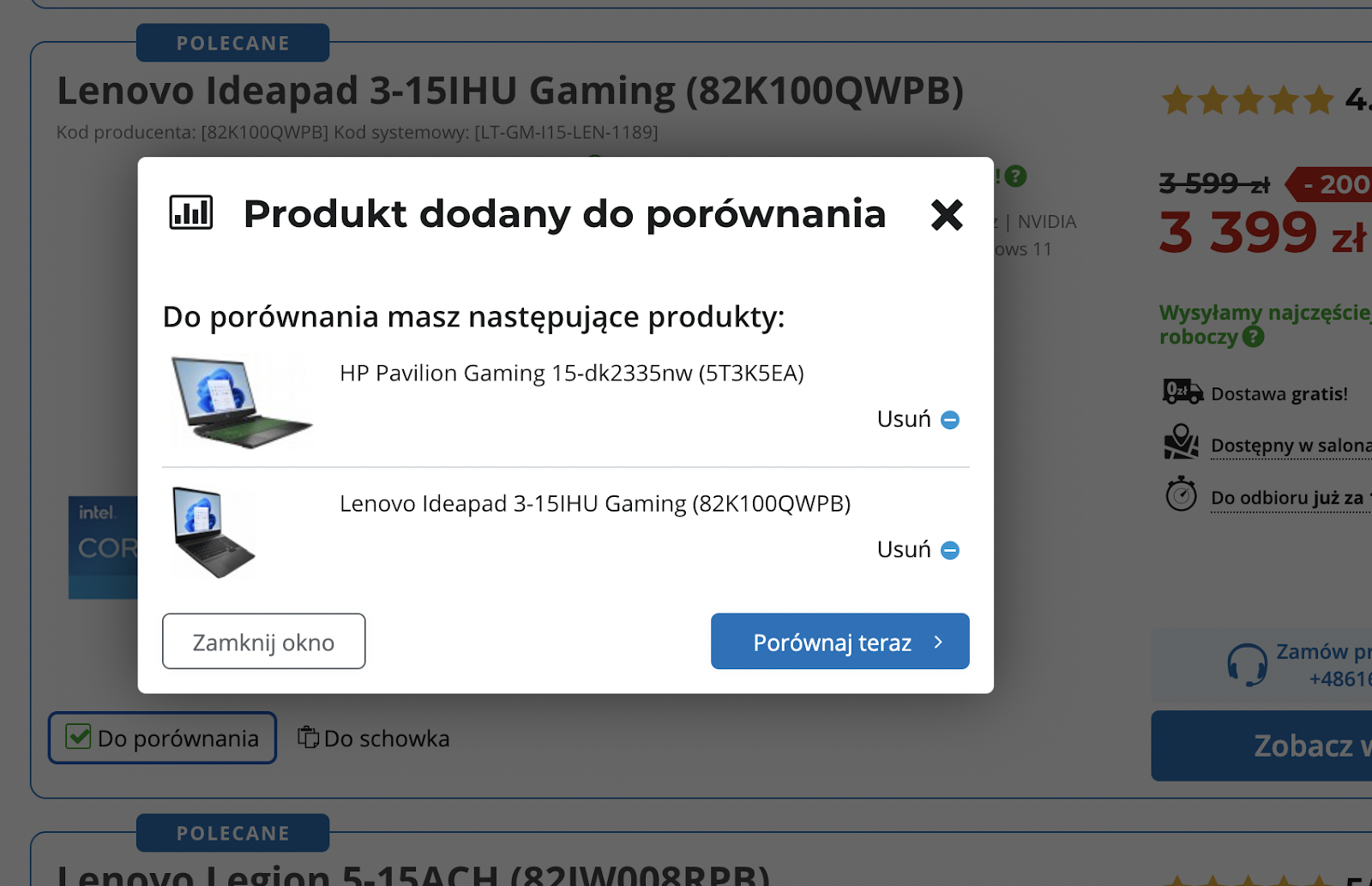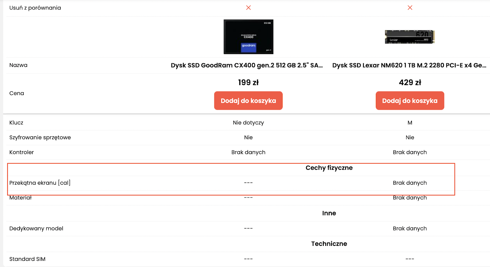 Zdj. Wyświetlanie właściwości, która nie występuje w porównywanych produktach