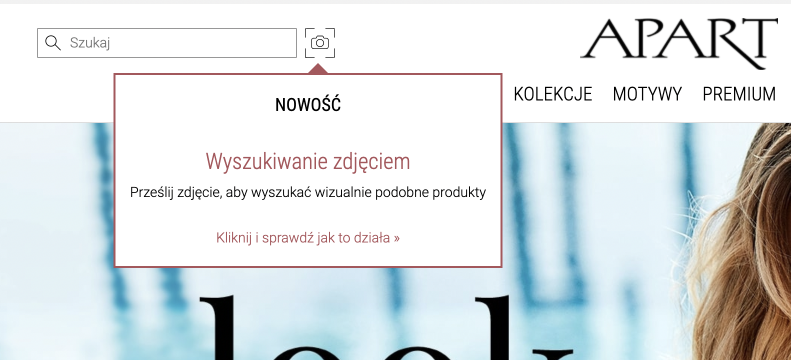 Coraz bardziej popularne staje się również umożliwienie wyszukiwania głosowego oraz obrazem, zwłaszcza w branży fashion. Te dodatkowe opcje oznacz odpowiednio, aby użytkownik wiedział, że istnieją i można z nich skorzystać. Ponieważ jest to dosyć nowa funkcjonalność w polskim e-commerce, warto wziąć przykład z apart.pl i przygotować instrukcję, jak skorzystać z takiej wyszukiwarki.